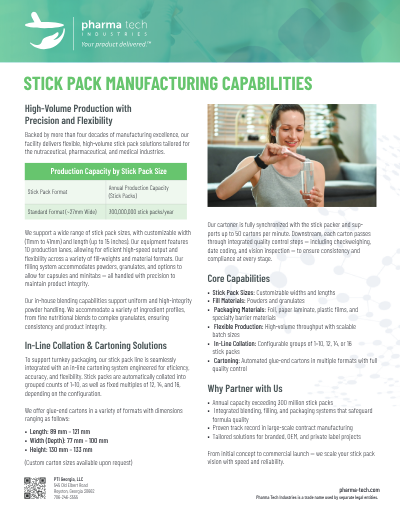As leading contract development and manufacturing organizations with combined experience of over 35 years, Pharma Tech Industries’ family of companies has brought to market a commercial portfolio for some of the largest pharmaceutical companies in the world, offering high volume/high automation solutions as well as more custom solutions for complex product formats. Our award-winning services are dedicated to delivering exceptional OTC & Personal Care products throughout all phases of manufacturing and packaging – from development to tech transfer to commercial production.